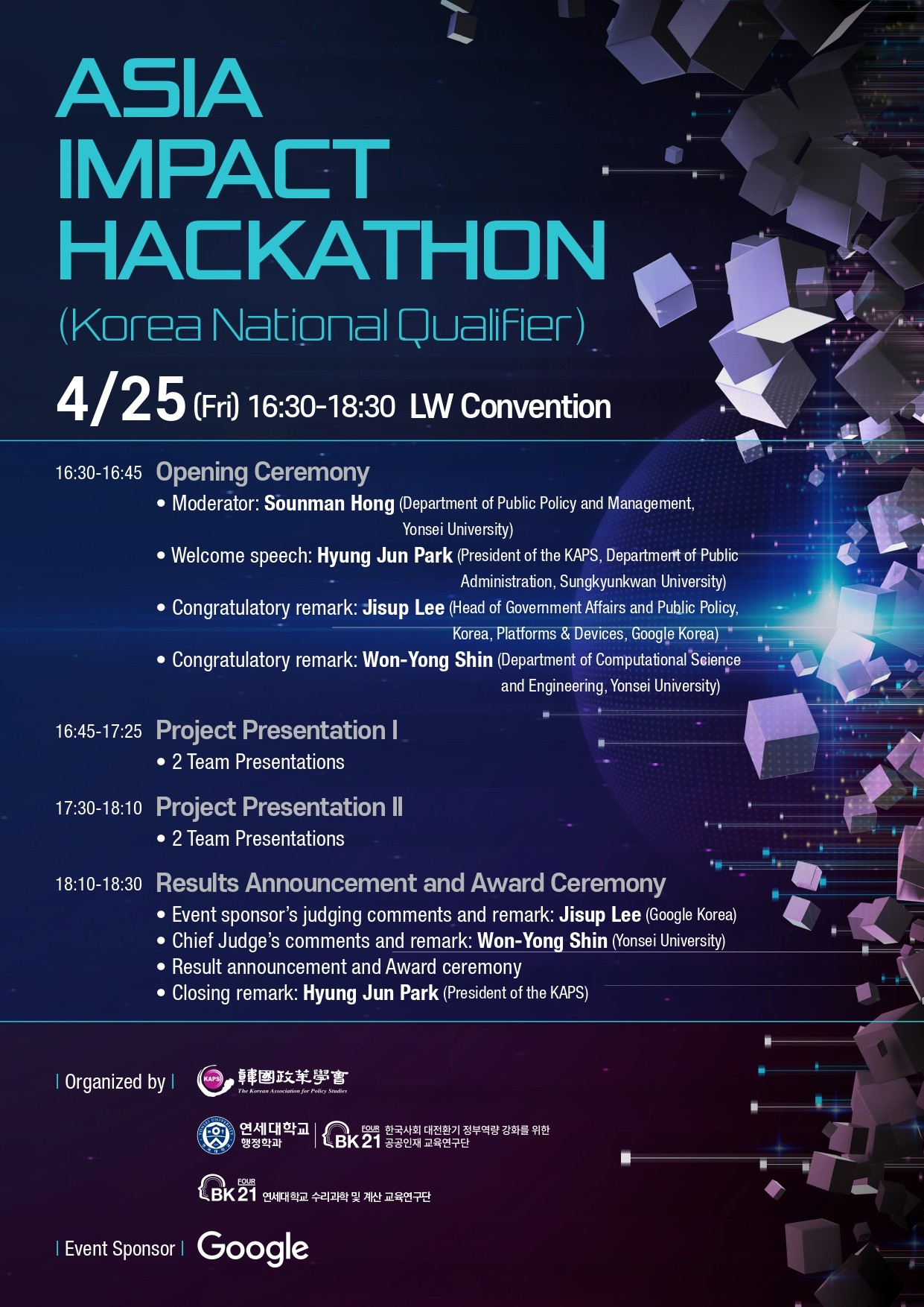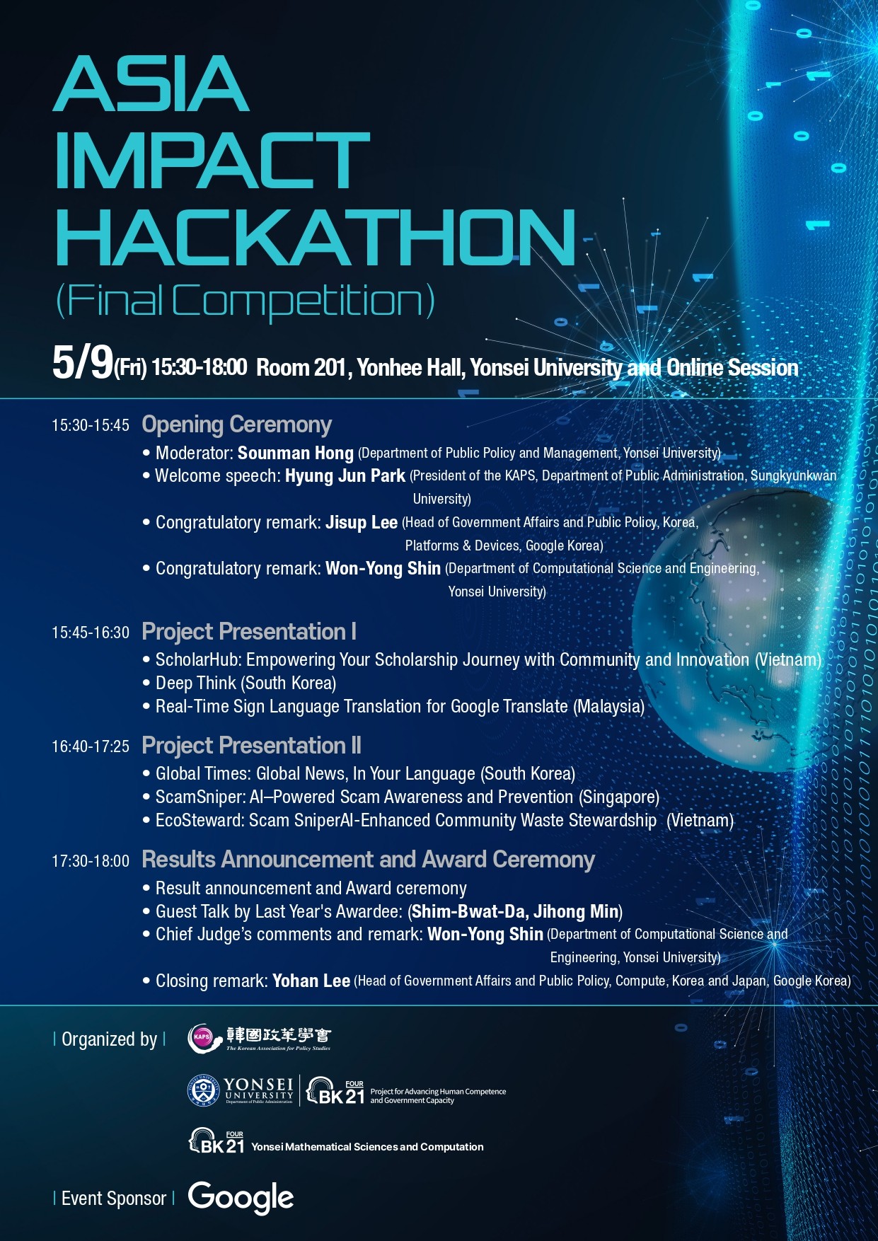 The hackathon was co-organized by Yonsei University (Department of Public Policy & Management and Department of Computational Science and Engineering) and the Korean Association for Policy Studies (KAPS), with invaluable sponsorship and support from Google.