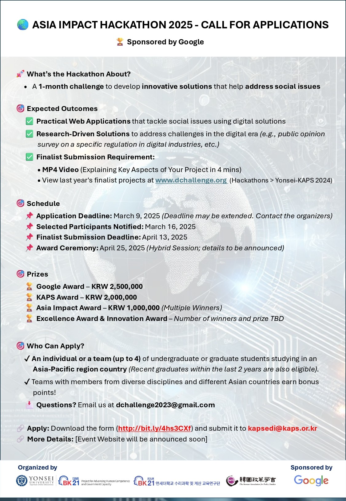 The 2025 Asia Impact Hackathon was designed as an educational initiative to inspire student-led innovation in addressing public challenges using digital technologies and AI. Building on the success of last year’s Yonsei-KAPS Hackathon, this year’s event expanded its global reach, fostering collaboration across disciplines and cultures throughout the Asia-Pacific region. The generous support from Google played a key role in enabling this broad impact.